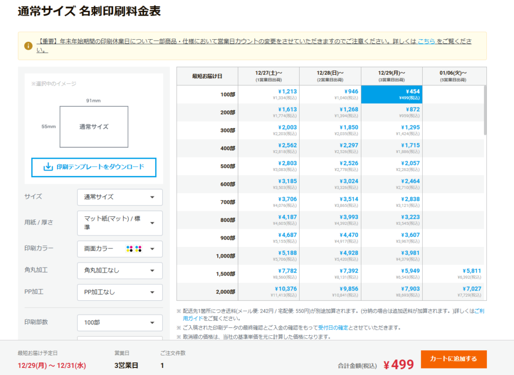 ・印刷カラー:両面カラー(※片面の場合は片面カラー)