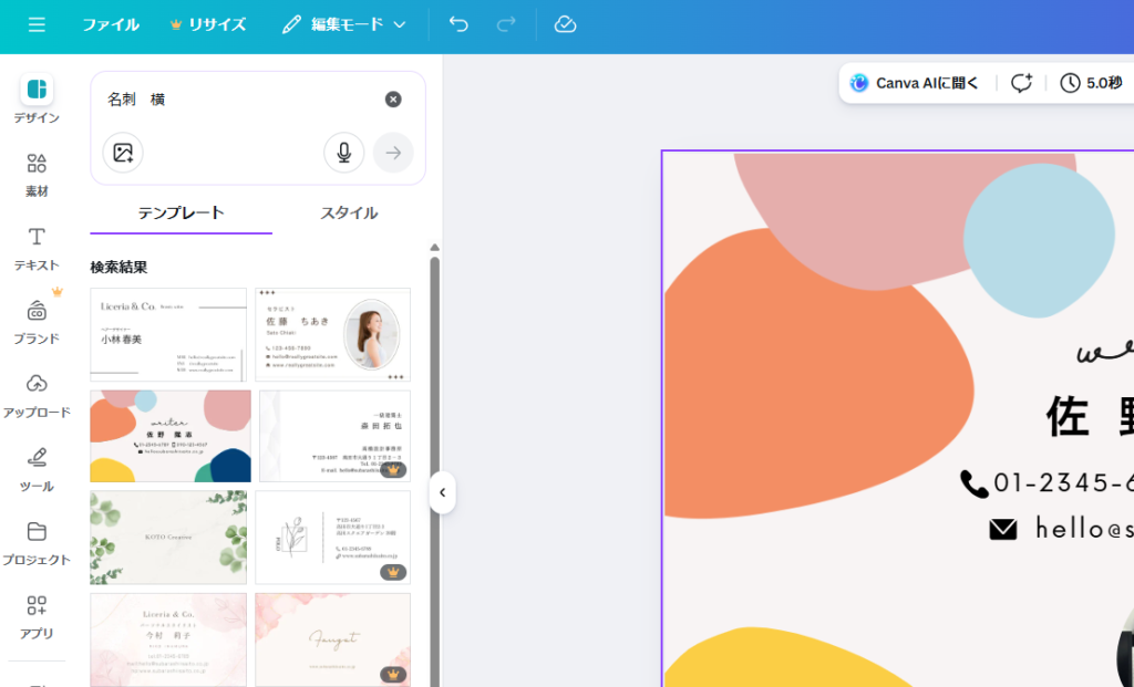 検索窓に「名刺」と入力すると、たくさんのデザインが表示されます。